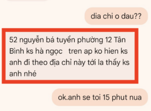 私が「dia chi o dau??」(住所どこ??)と尋ねると嬢が上記の通りnguyen ba tuyen通りの52番にあるKS ha ngoc=ハーゴックホテルと送ってきてくれています。